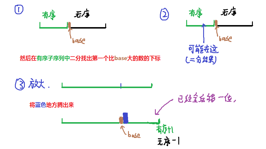 在维护一个有序序列的过程中,从左往右看,使用二分查找出第一个比 base 大的数的位置 l,然后将元素后移,在 l 处腾出空间,将 base 插入。