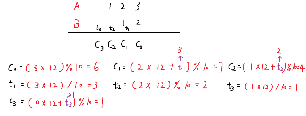 学累了就出去走走吧算法思想代码实现123456789101112131415161718192021222324252627282930313233343536373839404142434445#include <iostream>#include <cstring>#include <algorithm>using namespace std;vector<int> mul(vector<int> A, int b){ // 默认A 大于 b vector<int> C; int t = 0; for(int i = 0; i < A.size(); i++){ t += A[i] * b; C.push_back(t % 10); t /= 10; } // 如果t很大可能会留有剩余 while(t){ C.push_back(t % 10); t /= 10; } // 去除前导0 while(C.size() > 1 && C.back() == 0) C.pop_back(); return C;}int main(){ string a; int b; cin >> a >> b; vector<int> A; for(int i = a.size() - 1; i >= 0; i--) A.push_back(a[i] - '0'); vector<int> C = mul(A, b); for(int i = C.size() - 1; i >= 0; i--) cout << C[i]; return 0;}